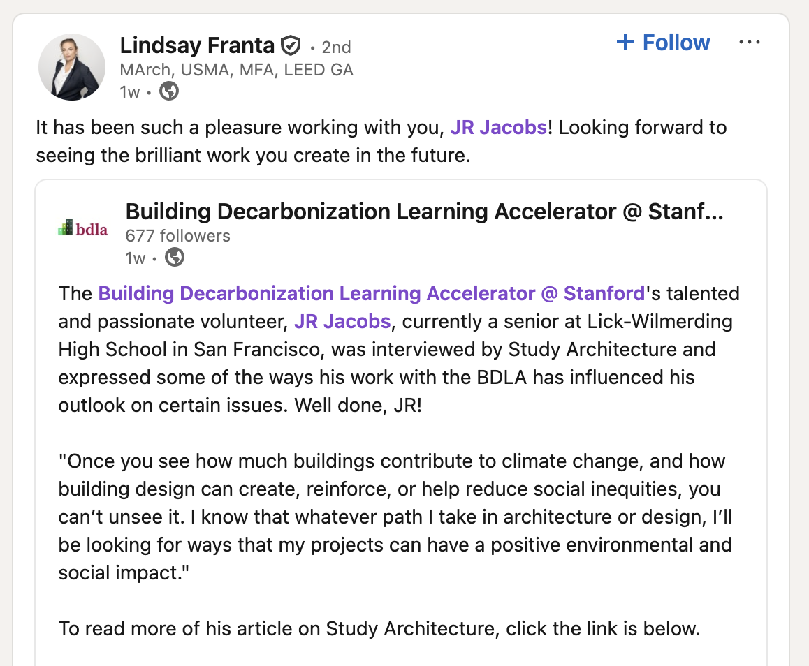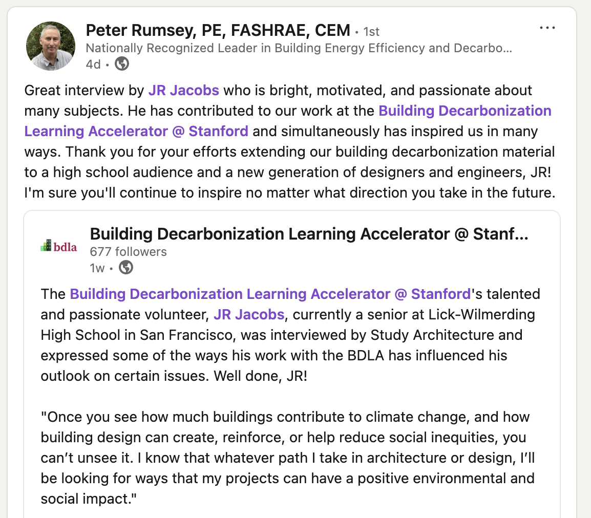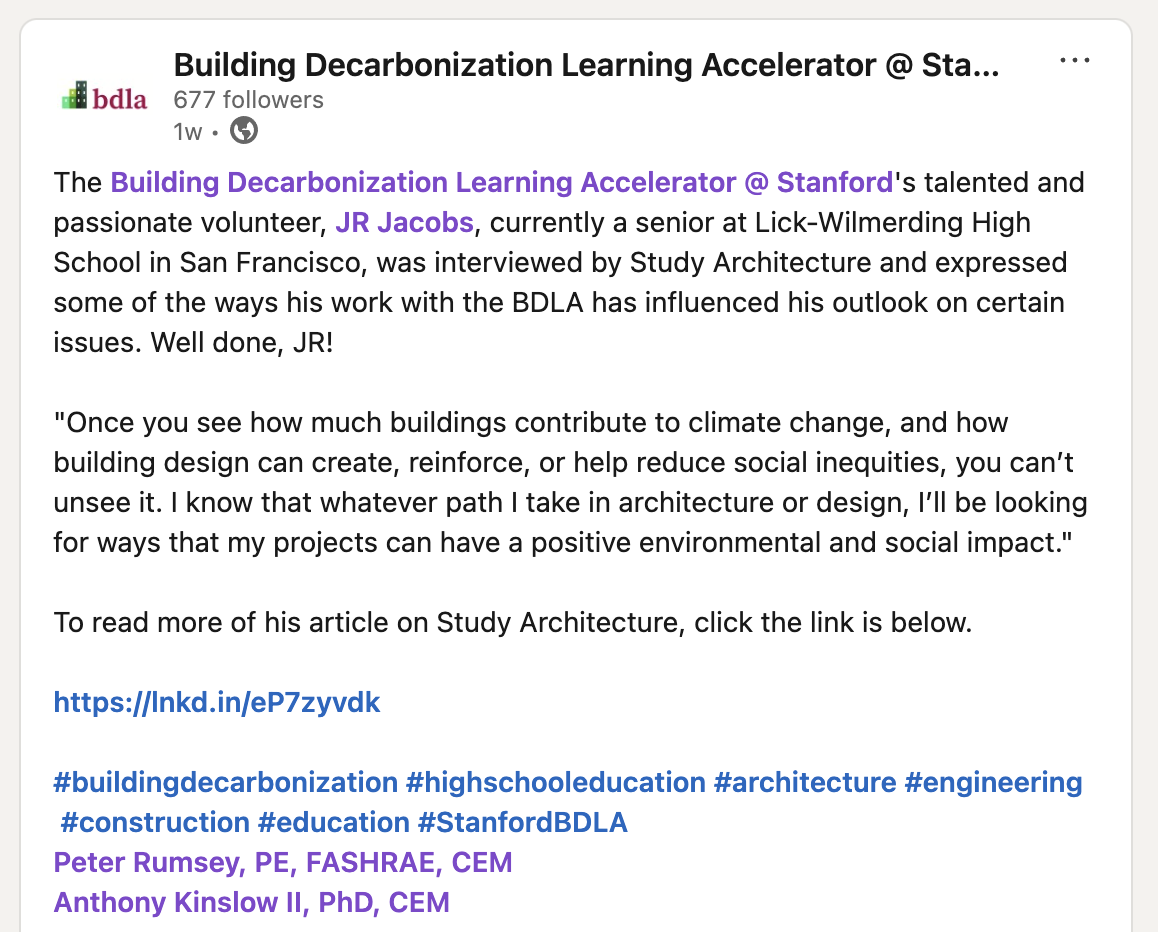 At the Stanford Building Decarbonization Learning Accelerator (BDLA), I create educational content that helps students and educators understand how buildings shape our climate future. Noticing a gap in sustainability education for younger audiences, I began adapting BDLA’s technical lectures into short, accessible videos. After cold-calling high school architecture programs across the country, these videos are now used in classrooms nationwide—one has become BDLA’s most-watched resource.